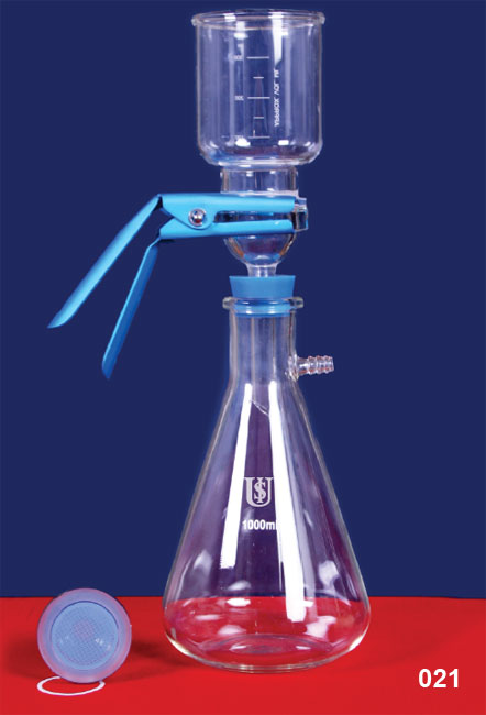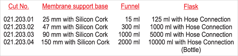 With Membrane support base blank base with Silicon cork and Stainless Steel Screen Teflon Coated, Teflon O Ring, Filtering Flask with Hose Connection and Aluminium Clump.